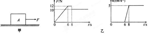14. (2013宁波)如图甲所示,放在水平地面上的物体A受到水平向右的力F的作用。力F的大小以及物体A的运动速度大小v随时间t的变化情况如图乙所示。当t=7s时,