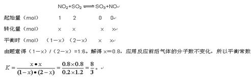 SO3(g)+NO(g)的特点体积不变的、吸热的可逆反应,因此a不能说明。颜色的深浅与气体的浓度大小有关,而在反应体系中只有二氧化氮是红棕色气体,所以混合气体颜色保持不变时即说明NO2的浓度不再发生变化,因此b可以说明;SO3和NO是生成物,因此在任何情况下二者的体积比总是满足1:1,c不能说明;SO3和NO2一个作为生成物,一个作为反应物,因此在任何情况下每消耗1 mol SO3的同时必然会生成1 molNO2,因此d也不能说明;设NO2的物质的量为1mol,则SO2的物质的量为2mol,参加反应的NO2的物质的量为xmol。