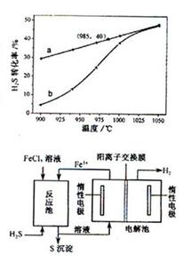 由图可知,当温度升高时,达到平衡的时间缩短了,也就是说升高温度加快了化学反应速率;②采用气、液逆流的方式进行,其目的是增大了气、液的接触面积,增大了化学反应速率,使反应更容易进行。根据反应池的结构,可知:参加反应的物质是H2S和2FeCl3 ,生成物是S 单质,说此反应为氧化还原反应,所以生成的物质还有FeCl2,即方程式为