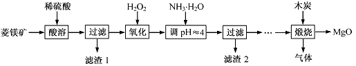 13.(2013·江苏化学·16)(12分)氧化镁在医药、建筑等行业应用广泛。硫酸镁还原热解制备高纯氧化镁是一种新的探索。以菱镁矿(主要成分为MgCO3,含少量FeCO3)为原料制备高纯氧化镁的实验流程如下: