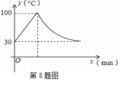 8、教室里的饮水机接通电源就进入自动程序,开机加热时每分钟上升10℃,加热到100℃,停止加热,水温开始下降,此时水温(℃)与开机