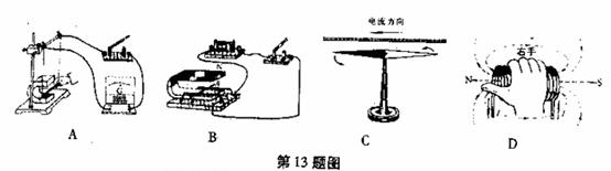 13.科学家探索自然界的秘密,要付出艰辛的努力,十九世纪英国科学家法拉第,经过十年坚持不懈的努力,发现了电磁感应现象,下图中能表明这一现象的实验是 [ ]