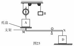 40.如图23所示,杠杆MON及支架是一个固连在一起的整体,且能绕O点转动,MO∶NO=5∶2。图中正方体D通过细线与N相连且与水平地面的接触面积S为8×10-2m2,物体B的质量为2kg。当物体A的质量为9.2kg时,杠杆在水平位置上平衡,物体D对水平地面的压强P1为4000Pa。当把物体A换为质量为32kg的物体C,支点向左移至O′,使MO′∶NO′=4∶3时,杠杆仍在水平位置上平衡,物体D对水平地面的压强P2为1250Pa。(杠杆、支架和托盘的重力不计,g取10N/kg。拉物体B的细绳系于物体B上表面中央并沿竖直方向)求: