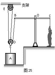 某科技小组设计的运动员利用器械进行训练的示意图的装置,如图25所示。图中横杆BC可绕固定点O在竖直平面内转动,OB∶OC=3∶2。配重A的质量为100kg,其底面积为5×10-2m2, E是定滑轮,D是动滑轮,定滑轮E和动滑轮D的质量相同。质量为60kg的小明站在水平地面上,当他对横杆C端通过细绳竖直向下的作用力为F1时,配重A对水平地面的压强为9×103Pa,此时,他对地面的压力为N1,动滑轮D对配重A的拉力为FA1; 当小明通过细绳对横杆C端竖直向下的作用力为F2时,配重A对水平地面的压强为5.4×103Pa,此时,他对地面的压力为N2 ,动滑轮D对配重A的拉力为FA2。已知N1∶N2 =10∶7不计绳的质量,不计滑轮与轴的摩擦,g取10N/kg。求: