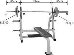 (1)杠铃杆两侧可以装配杠铃片,杠铃片按质量可分为5kg、10kg、15kg、20kg、25kg共5种型号。往空的杠铃杆上安装杠铃片时,先将一个杠铃片套在杠铃杆的一端,再将这个杠铃片水平向里推到图示位置,然后在杠铃杆的另一侧安装一个相同的杠铃片。试通过计算说明,在上述安装过程中,为了不使杠铃杆翻转,杠铃杆的 质量至少应为多少?(忽略杠铃片的厚度) (2)某人在一次健身时,20s内向上推举了l0次杠铃杆,已知杠铃杆和杠铃片的总质量为80kg,如果每次杠铃杆上升的高度为40cm,求他在这次健身时推举做功的功率。
