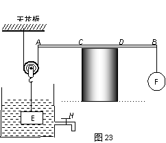 39.如图23所示,杠杆AB放在钢制圆柱体的正中央水平凹槽CD中,杠杆AB能以凹槽两端的C点或D点为支点在竖直平面内转动, CD=0.2m。细绳的一端系在杠杆的A端,另一端绕过动滑轮固定在天花板上,浸没在容器水中的物体E通过细绳挂在动滑轮的挂钩上,物体F通过细绳系在杠杆的B端。已知动滑轮的质量m0=1kg,物体E的密度r =1.2×103kg/m3,AB=0.6m,DB=0.2m。杠杆、细绳的质量及摩擦均忽略不计,g取10N/kg。打开阀门H将容器中的水逐渐放出,为使杠杆AB保持水平平衡,求: