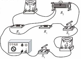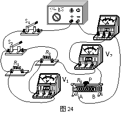 如图24所示,电源两端电压U保持不变。当开关S1闭合、S2断开,滑动变阻器的滑片P置于B端时,滑动变阻器接入电路的电阻为R3时,电压表V1的示数为U1,电压表V2的示数为U2;当开关S1闭合、S2断开,滑动变阻器的滑片P置于A端时,电阻R1消耗的电功率为P1,电流表A的示数为0.5A。已知:P1=2.5W,U1∶U2=1∶2,R2=8Ω。求: