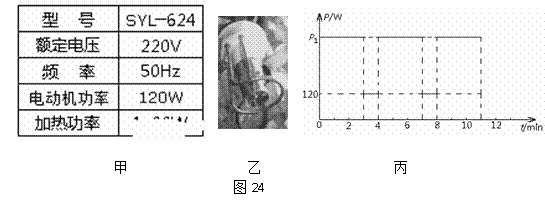 37.王明在家里找到一台全自动豆浆机,铭牌上一些参数看不清楚了,如图24甲所示。为了能正确使用这台电器,他将豆浆机和其他用电器连接到家庭电路中,然后进行如下实验观察:将豆浆机开关接通后,当豆浆机正常加热时,电能表在3分钟内恰好转动300转,断开豆浆机开关后,电能表在3分钟内恰好转动120转。已知他家电能表上标有3000R/k.Wh(表示每消耗1千瓦时的电能,电能表的转盘转3000转),家庭电路的电压为220V,王明做实验的时间内,家中其他用电器的用电情况没有变化。图乙是豆浆机的主要结构:中间部位是一个带动刀头的电动机,用来将原料进行粉碎打浆;外部是一个金属圆环形状的电热管,用来对液体加热煮沸。图丙是豆浆机正常工作做一次豆浆的过程中电热管和电动机交替工作时的“P-t”图像。(假定豆浆机电热管的阻值都不随温度变化)