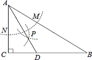14.如图7,在△ABC中,∠C=90°,∠B=30°,以A为圆心,任意长为半径画弧分别交AB、AC于点M和N,再分别以M、N为圆心,大于MN的长为半径画弧,两弧交于点P,连结AP并延长交BC于点D,则下列说法中正确的个数是