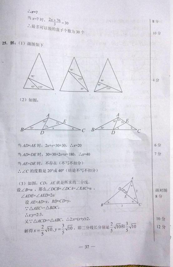 (1)请你在图2中用两种不同的方法画出顶角为45°的等腰三角形的三分线,并标注每个等腰三角形顶角的度数(若两种方法分
