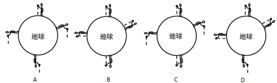 9.下图是描述地球上不同位置的人释放手中石块的四个示意图,图中虚线表示石块下落的路径,