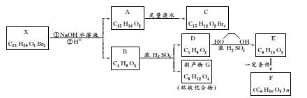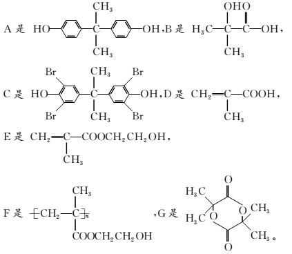 解析:比较A与C的分子式可发现C比A多了4个Br,少了4个H,说明发生了取代反应,可初步推断在A的结构中含有2个酚的结构单元,且其对位可能被占据;再分析A、B与X之间的关系,可推测X中具有酯的结构,是A中的2个羟基与B中的羧基脱水形成的酯,而X中的Br原子水解得到的羟基会在B分子中,即B中既含有羧基,又含有羟基,所以B在浓硫酸存在的条件下通过分子内消去脱水可得主要产物D,通过分子间酯化脱水得副产物G,D中含有碳碳双键,G中含有环酯结构;D与HOCH2CH2OH发生酯化反应,得到含有双键结构的酯E,酯E则能通过加聚反应得到高分子化合物F。经以上分析可得
