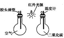 小实验:在两只烧瓶里分别充满CO2和空气,塞紧带有温度计和胶头滴管的橡皮塞。再把两只烧瓶放在红外线下照射,观察温度升高的情况(如右图所示)。结论:两瓶在相同光线照射下,装C02的温度较邻瓶高,最大可达4℃。据此完成16~18题。