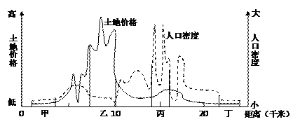 某城市东西相距25千米,甲、乙、丙、丁分别表示该城市不同的区域。下图为该城市沿东西方向“人口密度与土地价格分布曲线图”。读图完成19~20题。