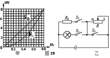 38.如图19所示是定值电阻R0和灯泡L的U-I图象,现将定值电阻R0与灯泡L接入如图乙所示的电路中,电源电压不变,当S1、S2、S3闭合时,灯泡L恰好正常发光,此时R0消耗的电功率为3.6W;当S1闭合,S2、S3断开时,把滑动变阻器的滑片P移至中点,变阻器消耗的功率为P1;把滑片P移至b端,变阻器消耗的功率为P2,且P1:P2=9:8