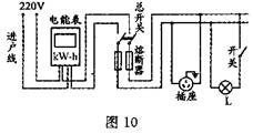 (6分)如图10是家庭电路的一部分.电能表的电流规格是“10(40)A”,L是“220V 22W”的节能灯,插座上接人“220V 220W”的电视机 (图中未画出).灯和电视机同时工作,求: