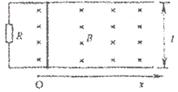 的电阻相连。导轨x>0的一侧存在沿+x方向均匀增大的稳恒磁场,其方向与导轨平面垂直(即竖直向下),磁感虚强度B =0.5十0.5x。一根质量m=0.lkg、电阻r=0.05