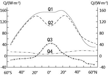 33. 图中表示海面热量总收支差额、辐射收支差额、蒸发耗热量、海-气热传导差额的曲线,依次是
