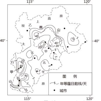 ⑴描述图示地区霾的年平均日数空间分布特点,并分析甲地霾日数夏季少于冬季的原因。(16分)