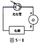 22.在右图5-1所示的光电管的实验中,发现用一定频率的A单色光照射光电管时,电流表指针会发生偏转,而用另一频率的B单色光照射时不发生光电效应,那么 ( )