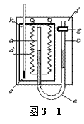 24.用右上面的实验装置可研究气体的等压变化规律。h是装满水的玻璃容器,a为一端封闭的玻璃管,b为两端开口的玻璃管,用橡皮管e将两管下端连接在一起,b管用g固定在可上下移动的标有刻度的木板f上,c为温度计,d是用来加热的电阻丝,a、b管内充有一部分水银,水银面等高,如图3-1所示。