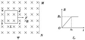如图9-3甲所示,一正方形单匝线框abcd放在光滑绝缘水平面上,线框边长为L、质量为m、电阻为R.该处空间存在一方向竖直向下的匀强磁场,其右边界MN平行于ab,磁感应强度B随时间t变化的规律如图乙所示,0~t0时间内B随时间t均匀变化,t0时间后保持B=B0不变.