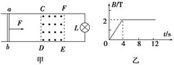 7.(2014·福建三明市联考)如图7甲所示,固定在水平面上电阻不计的光滑金属导轨,间距d=0.5 m,导轨右端连接一阻值为R=4 Ω的小灯泡L.在CDEF矩形区域内有竖直向上的匀强磁场,磁感应强度B随时间t变化如图乙所示,CF长为2 m.在t=0时刻,电阻为r=1 Ω的金属棒ab在水平恒力F=0.2 N作用下,由静止开始沿导轨向右运动,t=4 s时进入磁场,并恰好能够匀速运动.求:
