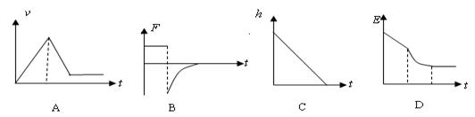 15.救灾人员从悬停在空中的直升机上跳伞进入灾区救灾,伞打开前可看作是自由落体运动,开伞后减速下降,最后匀速下落。在整个过程中,下列图像可能符合事实的是(其中t表示下落的时间、v表示人下落的速度、F表示人受到的合外力、h表示离地面的高度、E表示人的机