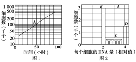 (2)在一个细胞周期中,G1期是合成前期,其DNA含量最少;S期是DNA的复制期,其含量逐渐增加;G2期(合成期)、M期(分裂期)由于在S期之后,它们的DNA含量是G1期的2倍。图2中,D的DNA含量是B的2倍,C的DNA量在D、B之间。因此,表示处于S期的是C,表示处于G2期、M期的是D,表示处于G1期的是B。