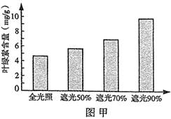 (1)图甲表示全光照和不同程度遮光对该植物叶片中叶绿素含量的影响。叶绿素存在于叶绿体中的___________上。需先用___________(填溶剂名称)提取叶片中的色素,再测定叶绿素含量。用纸层析法进一步分离色素时,叶绿素a和叶绿素b在层析液中溶解度较大的是_____________。据图分析,该植物可通过___________以增强对弱光的适应能力。