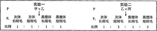 10.蝇的灰体(E)对黑檀体(e)为显性;短刚毛和长刚毛是一对相对性状,由一对等位基因(B,b)控制。这两对基因位于常染色体上且独立遗传。用甲、乙、丙三只果蝇进行杂交实验,杂交组合、F1表现型及比例如下: