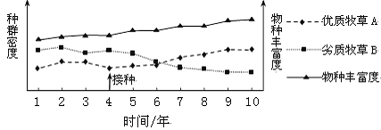 (4))在菌根形成率低的某高寒草甸试验区进行菌根真菌接种,可提高部分牧草的菌根形成率。下图为接种菌根真菌后试验区内两种主要牧草种群密度和群落物种丰富度的变化结果。
