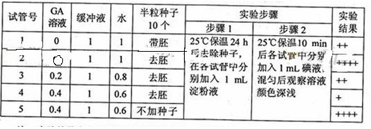 已知大麦在萌芽过程中可以产生a-淀粉酶,用GA(赤霉素)溶液处理大麦可使其不用发芽就产生a-淀粉酶。为验证这一结论,某同学做了如下实验: