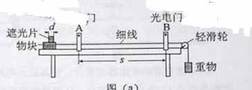 图(a)为测量物块与水平桌面之间动摩擦因数的实验装置示意图。实验步骤如下: ①用天平测量物块和遮光片的总质量M.重物的质量m:用游标卡尺测量遮光片的宽度d;用米尺测最两光电门之间的距离s;