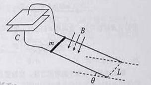 如图,两条平行导轨所在平面与水平地面的夹角为θ,间距为L。导轨上端接有一平行板电容器,电容为C。导轨处于匀强磁场中,磁感应强度大小为B,方向垂直于导轨平面。在导轨上放置一质量为m的金属棒,棒可沿导轨下滑,且在下滑过程中保持与导轨垂直并良好接触。已知金属棒与导轨之间的动摩擦因数为μ,重力加速度大小为g。忽略所有电阻。让金属棒从导轨上端由静止开始下滑,求: