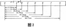 ②连接细绳及托盘,放人砝码,通过实验得到图2所示的纸带。纸带上0为小车运动起始时刻所打的点,选取时间间隔为0. 1s的相邻计数点A、B、C、D、E、F、G。实验时小车所受拉力为0. 2N,小车的质量为0.2kg。