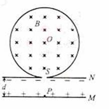 11.(18分)一圆筒的横截面如图所示,其圆心为O。筒内有垂直于纸面向里的匀强磁场,磁感应强度为B。圆筒下面有相距为d的平行金属板M、N,其中M板带正电荷.N板带等量负电荷。质量为m、电荷量为q的带正电粒子自M板边缘的P处由静止释放,经N板的小孔S以速度v沿半径SO方向射入磁场中.粒子与圈筒发生两次碰撞后仍从S孔射出,设粒子与圆筒碰撞过程中没有动能损失,且电荷量保持不变,在不计重力的情况下,求:![]()