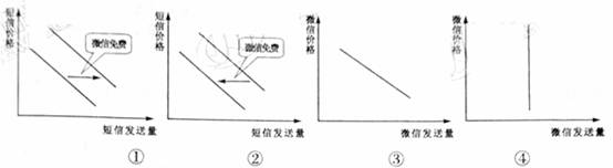 10、近两年,免费的互联网微信用户快速增长,这对电信运营商的短信发送量造成了不小的冲击。近来有“微信向用户收费”的声音,但网络调查表明,如果微信收费,有近九成的用户表示将改用其他免费社交软件。在其他条件不变的情况下,反映上述信息的图示是()