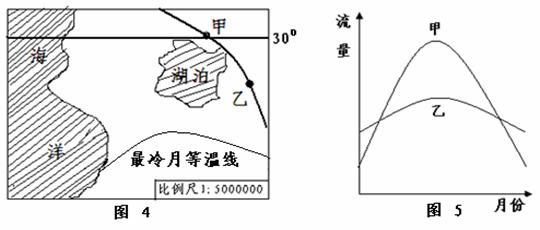 图4所示区域陆地地势平坦,图5为图4中河流甲、乙两处的年径流量曲线。读图回答6~7题。