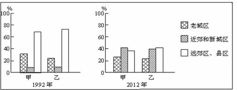 C.甲城市近郊和新城区人口比重变化幅度比乙城市大