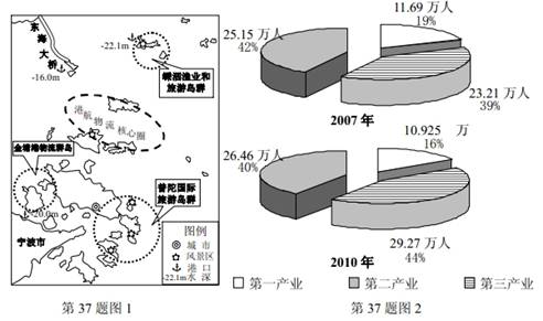 材料二: 图 1 为舟山群岛新区物流和旅游规划图。图 2 为舟山市 2007 年和 2010 年三次产业就业构成图。