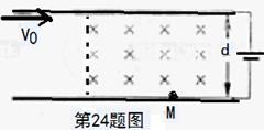 (20分)如图所示,两块水平放置、相距为d的长金属板接在电压可调的电源上。两板之间的右侧区域存在方向垂直纸面向里的匀强磁场。将喷墨打印机的喷口靠近上板下表面,从喷口连续不断喷出质量均为m、水平速度均为v0、带相等电荷量的墨滴。调节电源电压至U, 墨滴在电场区域恰能沿水平向右做匀速直线运动;进入电场、磁场共存区域后,最终垂直打在下板的M点。