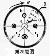 (22分)为了提高自行车夜间行驶的安全性,小明同学设计了一种“闪烁”装置。如图所示,自行车后轮由半径r1=5.0×10-2m的金属内圈、半径r2=0.40m的金属外圈和绝缘辐条构成。后轮的内、外圈之间等间隔地接有4根金属条,每根金属条的中间均串联有一电阻值为R的小灯泡。在支架上装有磁铁,形成了磁感应强度B=0.10T、方向垂直纸面向外的“扇形”匀强磁场,其内半径为r1、外半径为r2、张角θ=