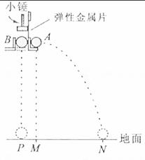 的A、B小球处于同一高度,M为A球中心初始时在水平地面上的垂直投影。用小锤打击弹性金属片,使A球沿水平方向飞出,同时松开B球,B球自由下落。A球落到地面N点处,B球落到地面P点处。测得