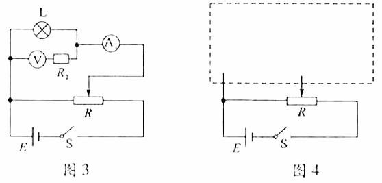 ③学习小组认为要想更准确地描绘出L完整的伏安特性曲线,需要重新设计电路。请你在乙同学的基础上利用所供器材,在图4所示的虚线框内补画出实验电路图,并在图上标明所选器材代号。