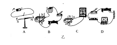 9、如图甲所示是一手压电筒,按压手柄,塑料齿轮带动磁性飞轮高速旋转,使灯泡发光。图乙四个实验中与手压电筒产生电流的工作原理相同的是( )