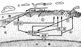 下为岩石圈物质循环示意图,岩石圈物质循环实质上是三大类岩石的相互转化。读图回答21~23