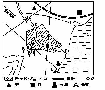 21、某工业城市拟在适当的位置(图中的A、B、C、D、E、F处中)新建化工厂、自来水厂、钢铁厂、水泥厂,请根据影响工业区位的主要因素,同时考虑对环境的保护,选择合适的区位,布局相关企业。(16分)