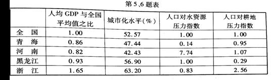 区域人口对资源压力指数是全国某资源人均占有量与区域该资源人均占有量之比,此比值可作为判断区域人口规模适宜程度的指标之一。读表,完成第5、6题。