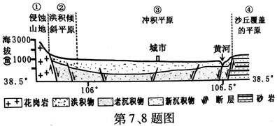 下图为我国某地沿北纬38.5°所作的地质构造、地貌剖面图,图中一般地势较高地下水埋藏越深。读图,完成第7、8题。